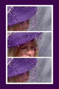 Theme to design a hat based on a song. I chose to create a hat based on the epic ballad by Prince, Purple Rain. It is a hand-blocked circle base with  a button crown base and over a 1000 glass crystal beads, hand-beaded on to wire and hand-stitched into place to create the purple rain drops.
